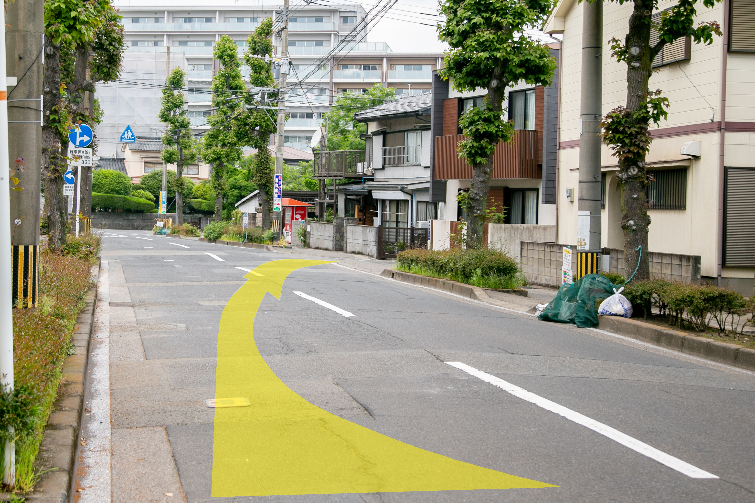 こちらの歩道橋を目印に、歩道橋の信号を左折してください